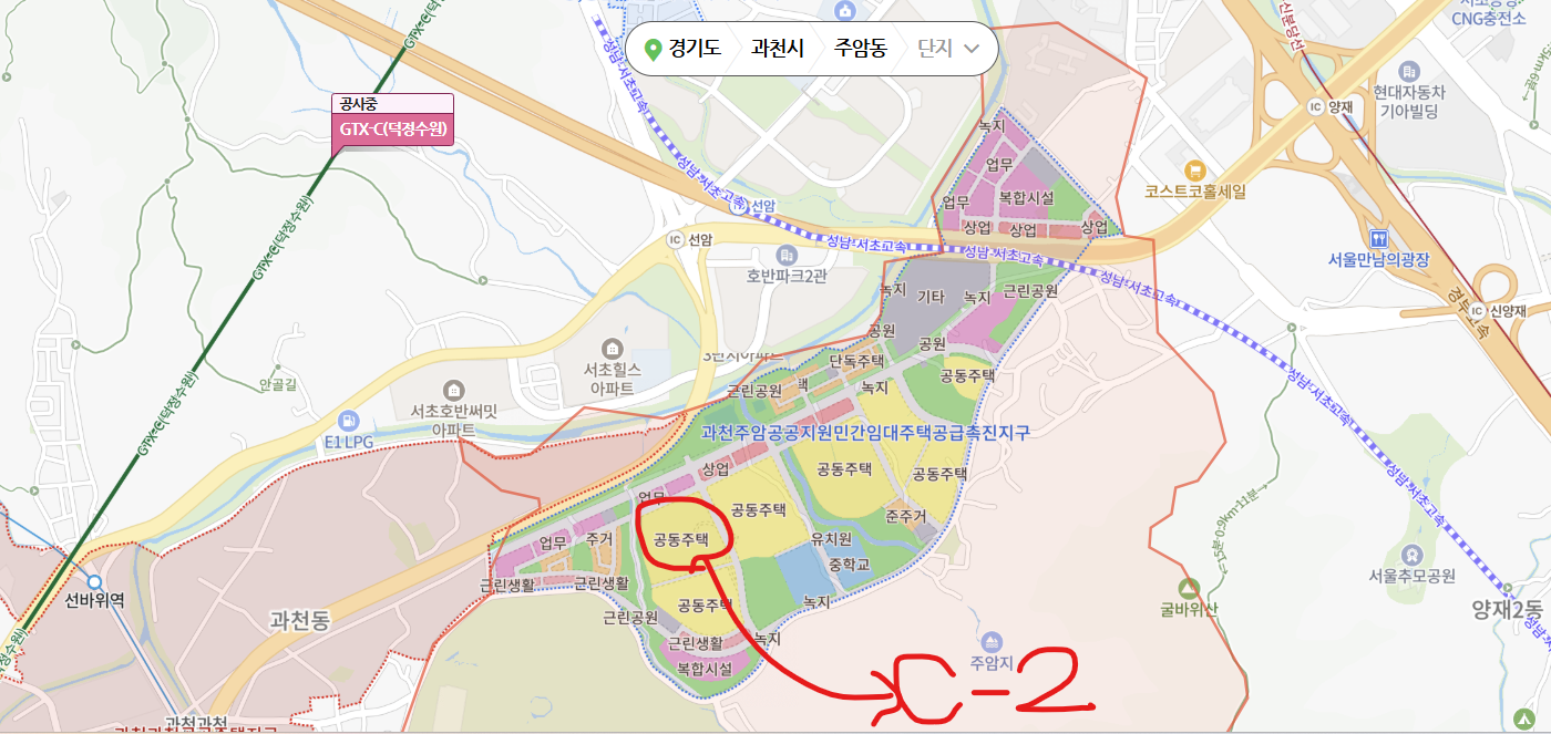 과천 주암지구 신혼희망타운 C-2 단지가 2025년 8월에 분양한다. 1. 주암지구주암지구는 공공지원 민간임대주택지구 로서 신혼희망타운·행복주택 등 청년·신혼부부 위주의 공공지원 민간임대 주택 타운이라고 보면 된다. 따라서 분양가가 매우 저렴하다. 2. C-2단지 위치이번에 분양하는 C-2 단지는 아래에 위치해 있다. 초등학교는 1개 블록 옆에 생기며, 도보로 5분이면 갈 수 있을 거리로 보인다. 교통은 버스 노선이 생길 것으로 보인다.근처에 있는 우면동 서초힐스 아파트에서 선바위역이 10분, 양재시민의숲역이 12분 걸리니 참고하자. 지하철이 쟁점이다. 위례과천선이 우면동을 지날 것인지, 주암동을 지날 것인지 확실히 결정이 안 난 것으로 보인다. 3. C-2단지 청약 가능 조건-수도권 무주택세대구성원..