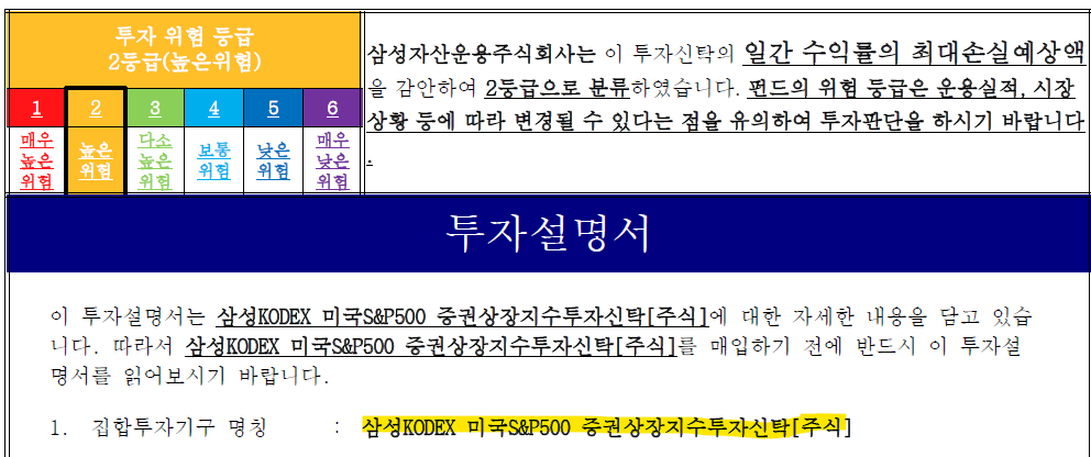 여기서, 조금만 밑으로 내려가면 투자설명서가 있다. KODEX 미국S&P500의 진짜 펀드명은 삼성KODEX미국S&P500증권상장지수투자신탁[주식] 이다.