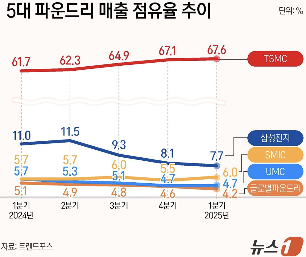 하지만 요 몇 년 간 점유율을 보면 TSMC가 "독점"을 하고 있다고 해도 과언이 아니다.